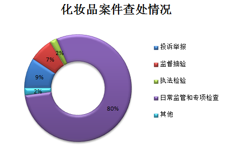 图3-2-1 2018年三季度全省药品案件来源分布图 三、地方药品抽检情况2018年三季度,全省共抽验药品主体4738家,抽验6086批次,检验不合格333批次,不合格率5.5%。其中国家基本药物抽验主体1888家,检验2172批次,检验不合格268批次,不合格率12.3%。详见附表8。 四、药品投诉举报情况2018年三季度,全省共受理药品投诉举报1187件(同比增长37.4%),占投诉举报总量(食品、保健食品、药品、AG真人娱乐娱乐、化妆品)的7.6%。立案63件,结案62件。 五、食品药品监管部门查办侵权假冒案件情况2018年三季度,生产销售假药立案76件,货值金额2.12万元,行政处罚案件信息公开数20件,符合公开条件的行政处罚案件22件;生产销售劣药案件共立案498件,行政处罚案件信息公开数240件,符合公开条件的行政处罚案件245件。 第四部分化妆品监督管理一、 化妆品生产企业日常监督情况2018年三季度,全省共检查化妆品生产企业570家,检查化妆品生产企业832家次,出动检查人员9202人次,检查化妆品品种3408种次,抽验化妆品265批次,未检出不合格化妆品,发现生产记录缺失、不完整168家,完成整改的企业199家。 二、化妆品案件查处情况2018年三季度,全省各级食品药品监管机构共查处化妆品案件141件,其中一般程序案件134件,简易程序案件7件,涉及物品总值12.15万元,罚款27.02万元,没收违法所得金额4.17万元,责令停产停业5户,无移送司法机关案件,无刑事判决案件,行政处罚案件信息公开81件,符合公开条件的行政处罚案件84件。详见附表9。 从案件来源看,投诉举报13件,监督抽检10件,执法检验3件,日常监管和专项检查112件,其他3件。 从违法主体看,生产企业违法主体3件,经营企业违法94件,美容美发机构违法32件,其他违法12件。