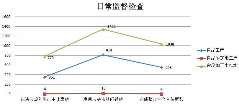 图1-1-2 2018年三季度全省食品流通环节分布图 (二)食品日常监管情况1、食品生产环节日常监管情况 2018年三季度,全省日常监管工作中,共检查食品生产企业5646家、食品添加剂生产企业100家、食品加工小作坊12119家。出动检查人员42745人次,其中食品生产企业15875人次,食品添加剂生产企业290人次,食品加工小作坊26580人次。快检生产主体数517家次,其中食品生产企业217家次,快检食品加工小作坊300家次;快检食品批次数8073批次,其中食品生产企业7377批次,快检食品加工小作坊696批次;快检不合格食品批次数54批次,其中食品生产企业20批次,快检食品加工小作坊34批次。详见附表2。 日常监督检查中发现违法违规的生产主体数1134家次,其中食品生产企业351家次,食品添加剂生产企业4家次,食品加工小作坊779家次;发现违法违规问题数2171个,其中食品生产企业814个,食品添加剂生产企业13个,食品加工小作坊1344个;完成整改生产主体数1595家次,其中食品生产企业553家次,食品添加剂生产企业4家次,食品加工小作坊1038家次。