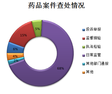 图3-1-2 全省药品经营企业日常监管情况 二、药品案件查处情况2018年三季度,各级监管机构共查处违法药品案件总数1409件,其中一般程序案件918件,简易程序案件491件,货值金额407.4万元,罚款金额465.28万元,没收违法所得金额140.55万元;取缔无证经营4户,责令停产停业9户,吊销经营许可证7件,移送司法机关案件数20件,行政处罚案件信息公开数689件,符合公开条件的行政处罚案件693件。 从案件来源看,投诉举报80件,监督抽验213件,执法检验72件,日常监管和专项检查964件,其他部门通报31件,其他49件。 从货值来看,5万元以下的案件1403件,5万元以上的案件6件。